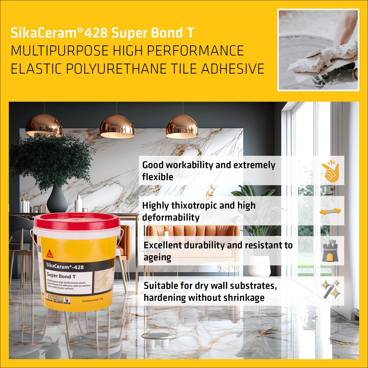 SikaCeram®-428 Super Bond T is a two-component, high performance, elastomeric polyurethane resin adhesive. It’s specially formulated to provide strong adhesion on deformable surfaces with zero vertical slip, making it ideal for demanding tile installations where both flexibility and durability are required.