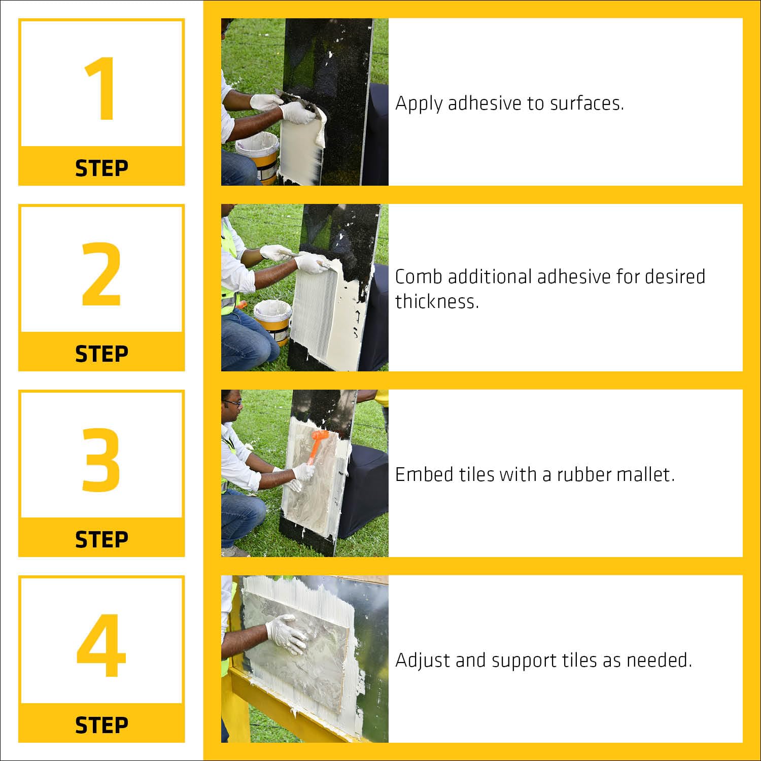 - Apply using appropriate trowel. For large tiles or thin tiles, employ back-butter technique to ensure full contact.